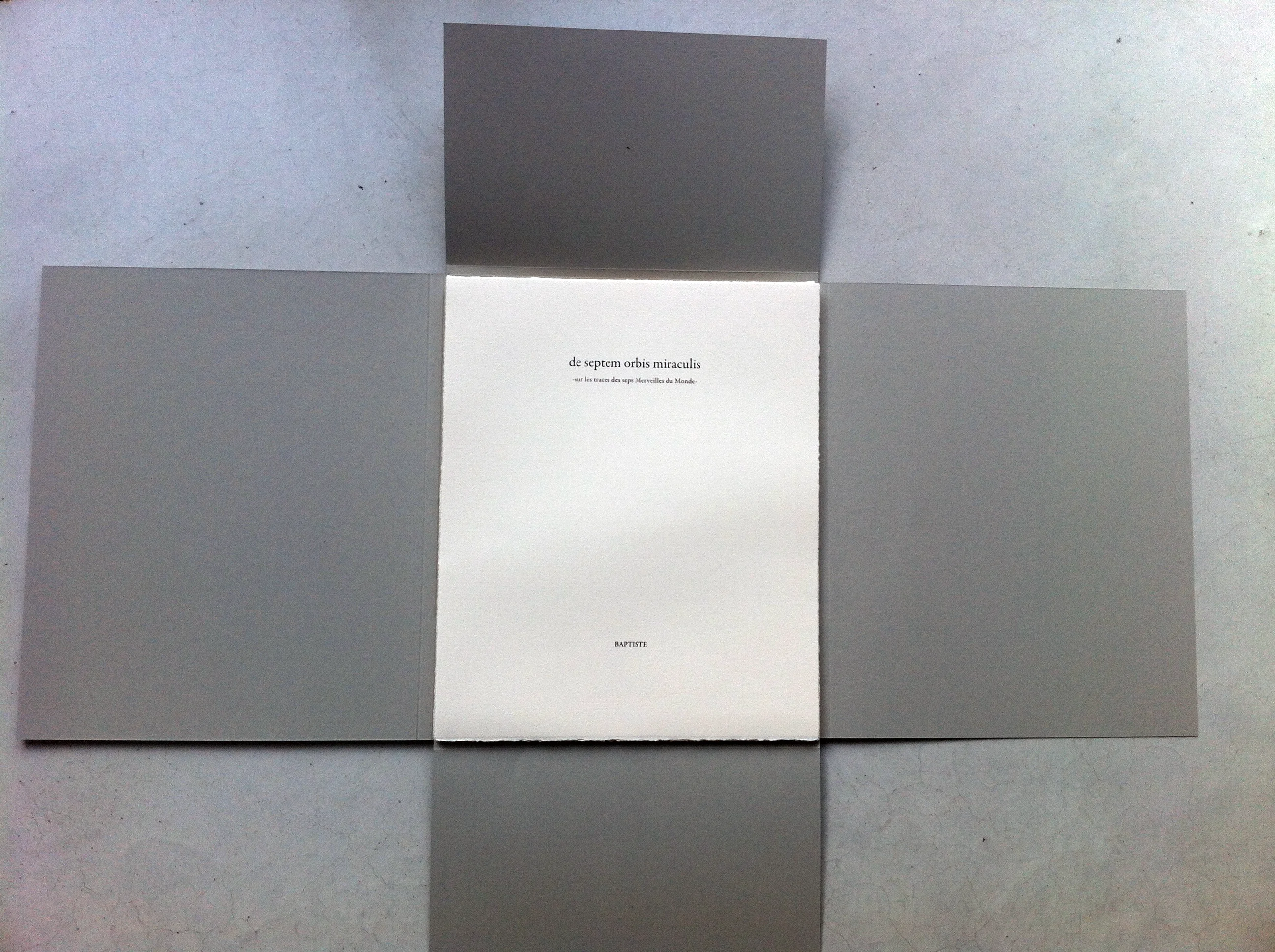 Le projet "De septem orbis miraculis", sur les traces des Sept Merveilles du monde, repose sur des séries de peintures dont les parcelles de terres provenant des sites des 7 merveilles, cette édition limitée de sept gravures présentant la topographie de ces sites, une série de "poussières", une installation réalisée avec de la terre et de l’eau provenant de la mer Méditerranée et des fleuves limitrophes de ces merveilles, ainsi qu'une vidéo, nommée "Nostos". Son installation est repensée in situ pour chacune de ses étapes (installation terre et eau notamment).
