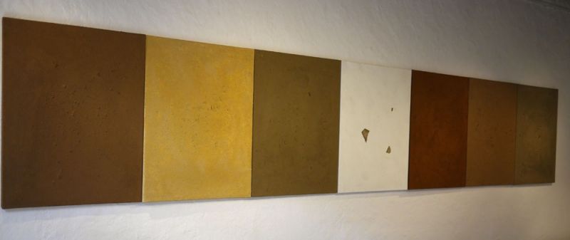 En un temps où l’on s’interroge sur la mémoire et l’histoire, le peintre Baptiste, traque les vestiges du présent. Il développe une oeuvre dont le vocabulaire pictural combine la trace, l’empreinte et les mots. D’une géographie à l’autre, et dans le sillage d’Ulysse, il amasse des fragments de terres, roches et autres matériaux qu’il sédimente sur la toile blanche et convoque un espace pictural, devenu un territoire de mémoire. Comment relier à la chose perdue ? Aujourd’hui, dans sa quête de l’origine, Baptiste a choisi dans l’expérience de son geste, d’aborder la mémoire des Sept Merveilles du monde. Que savons-nous d’elles ? Elles superposent deux histoires : celle de leur antique réalité et celle de leur destinée ultérieure où elles sont devenues des symboles de splendeur et de prestige. Elles contiennent en elles les rêves du passé et les aspirations de l’avenir. Quand les repères archéologiques s’effacent, comment le geste du peintre, peut-il s’inscrire dans une démarche plasticienne et contemporaine ? La pratique du fragment répond à la métaphore. Baptiste instaure une unité de mesure, pour les 6 merveilles disparues, et désigne la trace sous forme de parcelles de terres. Chaque lieu échappe ainsi à la narration et se dévoile comme un mètre carré de terre. Sept merveilles, sept paysages-parcelles, ses peintures et gravures sont à la fois surface, lieu et mémoire où le regard va chercher à capter la trace de ce qui à été et de ce qui peut être désormais. Entre la trace et le monument, la peinture se fait témoin. Elle réactive le souvenir et empêche l’oubli mais ici sans récit ou nostalgie. Sept Merveilles est une installation nourrie de l’expérience du temps et de la mémoire. Elle se présente comme une nouvelle proposition de monument et interroge le statut de la peinture dans son rapport à l’histoire.