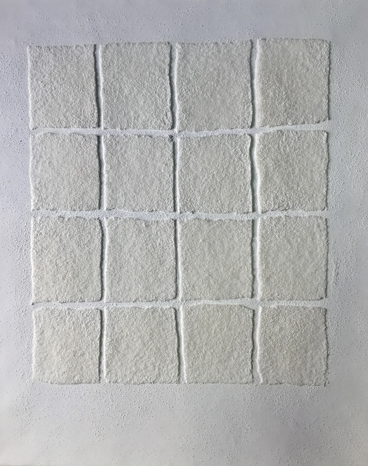 En archéologue minutieux il recueille des traces de sédiments qu'il ordonne en châteaux de sable ; il rend visible les frontières et l'essence organique des choses.