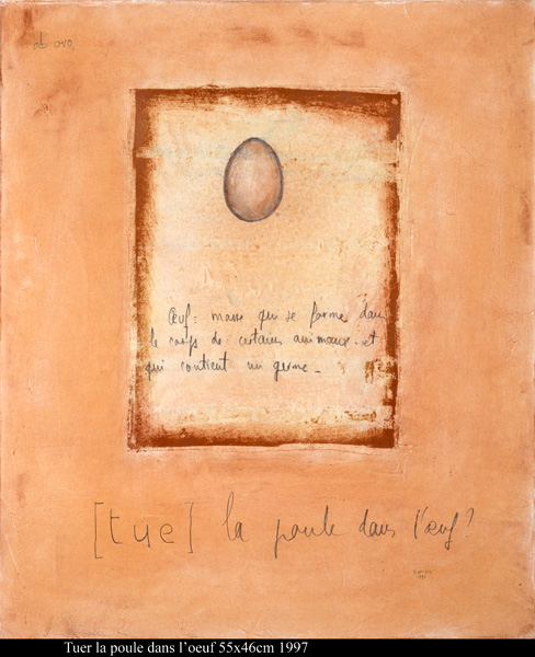 Ces reliques de terre et d'eau sont la matière sacrée de ses toiles, elles tissent le corps de sa peinture. Peinture de signes, de traces, d'empreintes, rythmée de cartes et de frontières, elle rappelle les carnets de route des premiers voyageurs où s'imprime le moule de l'expérience vécue, la mémoire de la chose perdue. Dans le sillage d'Ulysse, omniprésent, l'artiste reprend avec émerveillement les mêmes routes et remonte le fil des origines. Sédiment de toutes les histoires humaines, le héros de l'Odyssée s'immisce dans l’œuvre comme le ferment et la source imaginaire d'un perpétuel questionnement…